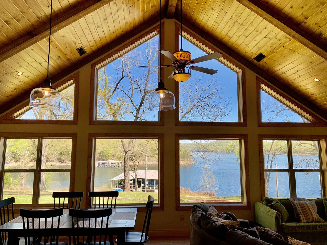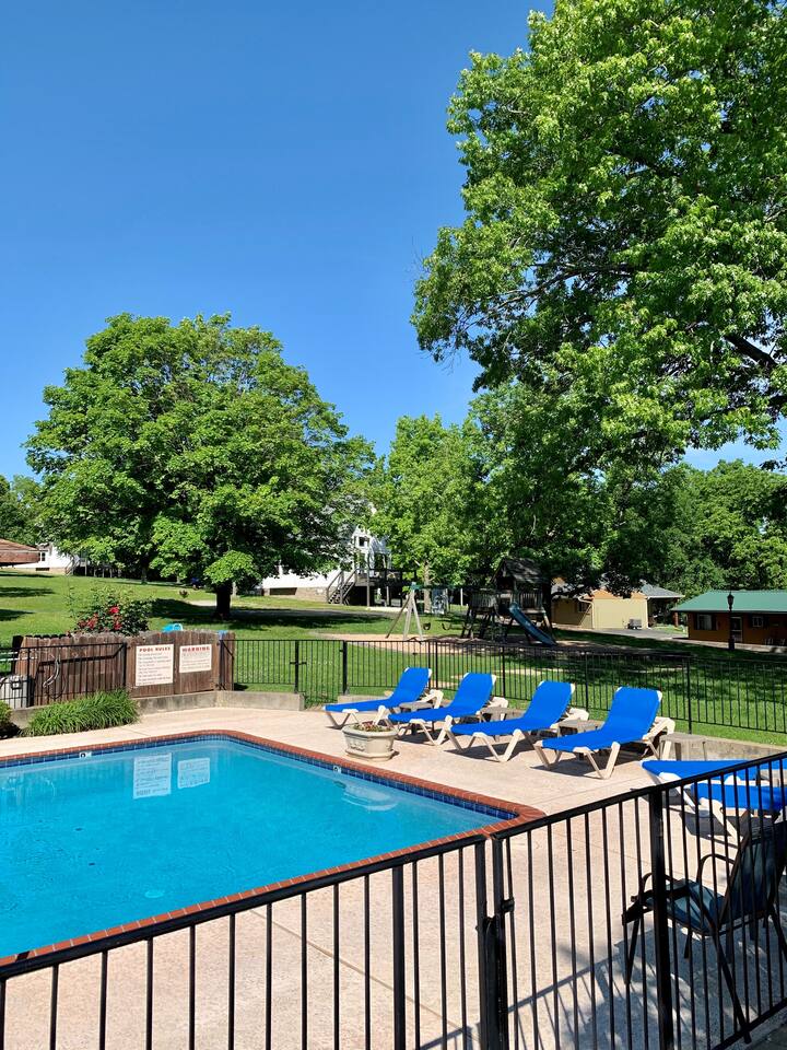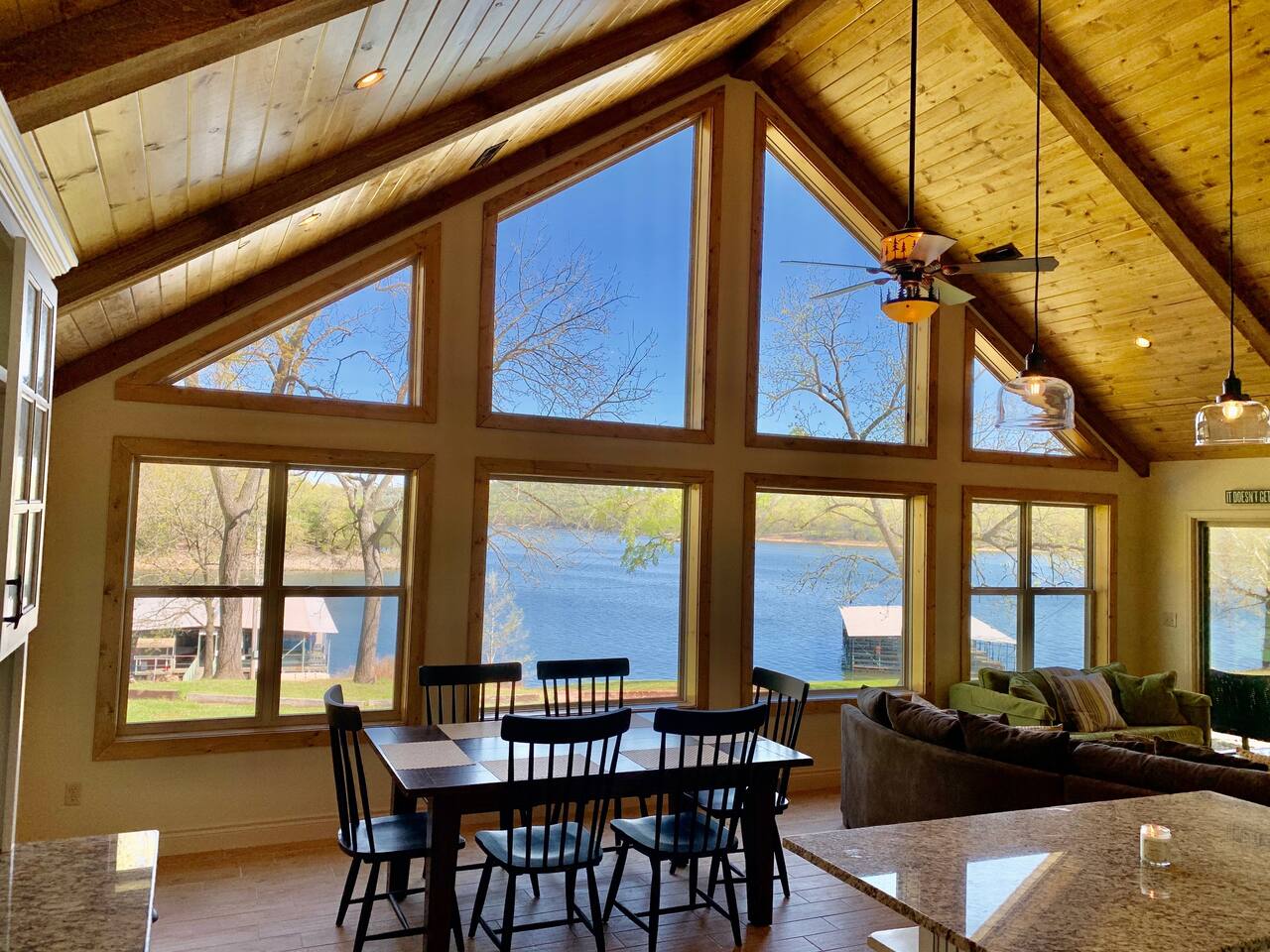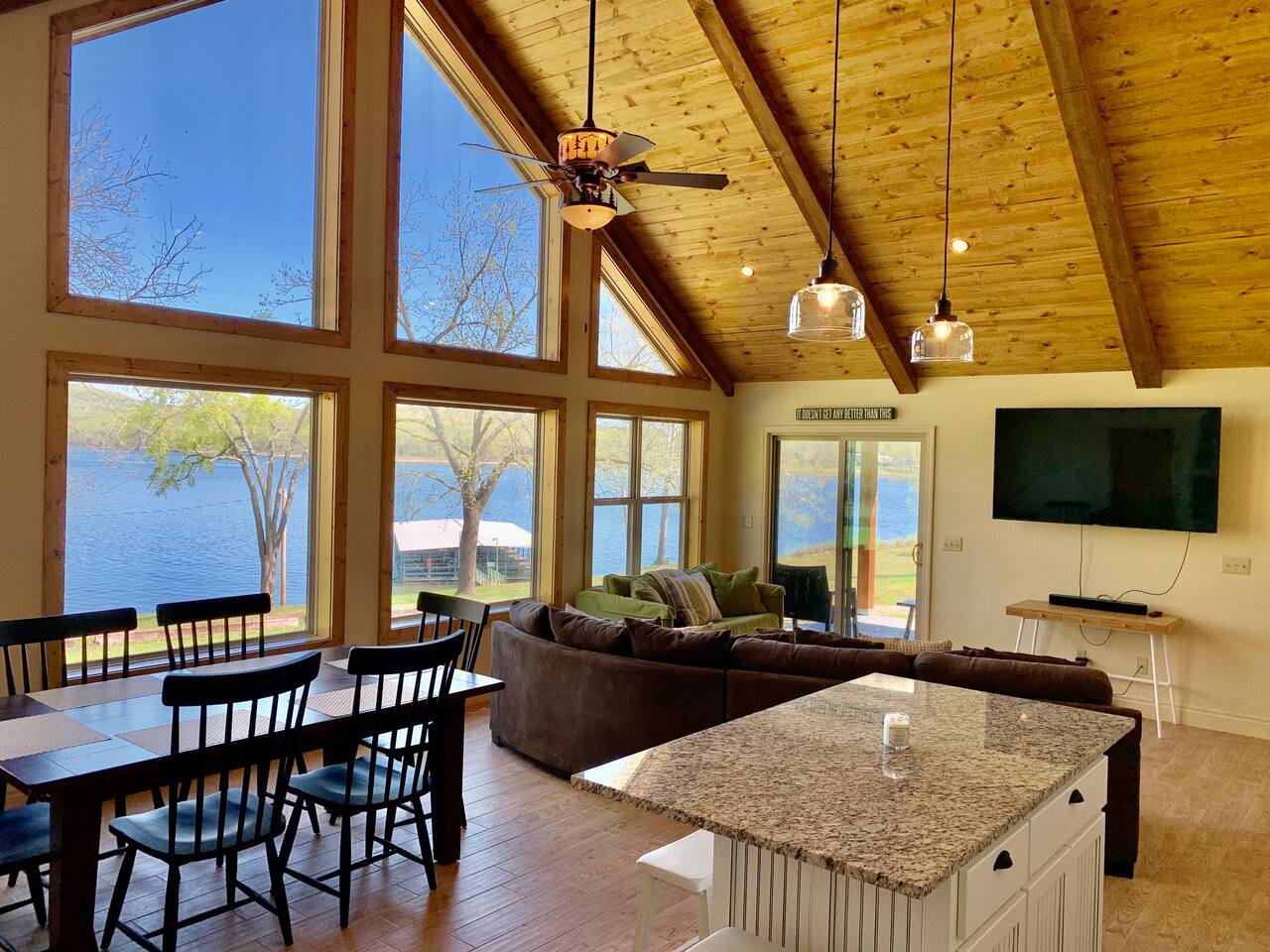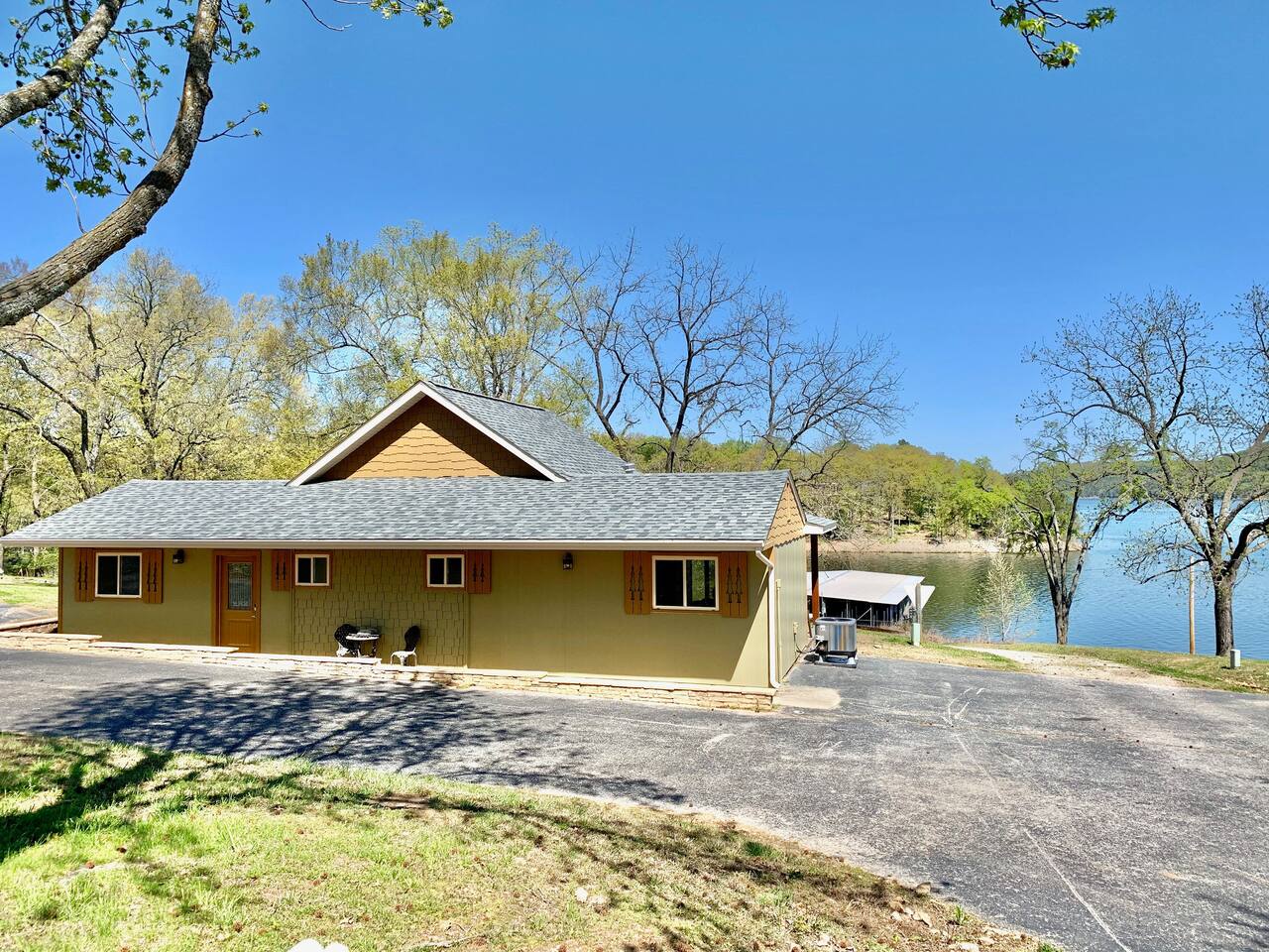 Beautiful lakefront cabin with breathtaking views of Table Rock Lake in Shell Knob, MO—perfect for a peaceful and relaxing getaway. Nestled within a quiet, gated community, this well-appointed 3-bedroom, 2-bathroom retreat offers everything you need for a memorable stay, including access to fantastic amenities like an in-ground pool, a play area for the kids, and a laundry room. The open-concept kitchen and living room is the heart of the home—a wonderful space to gather and enjoy the stunning floor-to-ceiling windows that frame picturesque lake views. The updated kitchen features granite countertops, stainless steel appliances, a gas stove, and a dishwasher. It's fully stocked with cookware, utensils, and more, ensuring you have everything you need to prepare meals. The large island offers plenty of seating for casual dining or conversation, with additional seating available at the spacious wood kitchen table. The living area invites you to unwind on the comfortable sectional and loveseat while streaming your favorite shows or movies on the large flat-panel smart TV with YouTube TV. A Sonos speaker allows you to fill the space with your favorite tunes, whether from your own library or streaming services like Pandora or Spotify. WiFi is available throughout the cabin to keep you connected. Wake up to breathtaking lake views in the master bedroom, which features sliding door access to a covered patio, a luxurious king bed, and an en-suite bathroom for added comfort and privacy. The second bedroom also offers stunning lake views and includes a queen/twin-XL bunk bed, making it ideal for another couple or the kids. The third bedroom is equipped with a cozy queen bed. All bedrooms come with closet space and convenient luggage racks to make your stay even more comfortable. Start your morning with a steaming cup of coffee as the sun rises or unwind in the evening with a refreshing cocktail while soaking in the serene lake views from the covered patio. The lake is just a short walk away, down a gently sloping hill, perfect for a peaceful stroll. For those who enjoy outdoor cooking, a Weber kettle and grilling tools are provided right next to your patio. Kids will delight in the nearby play area and swimming pool, which are just a few steps away and easily visible from the patio seating area, giving parents peace of mind. In the evenings, gather around the private wood firepit, complete with spectacular views of Table Rock Lake, for a memorable and relaxing experience. Looking for water access? Our cabin is near a public boat launch and two great marinas for slip and/or boat rental. Campbell Point Marina is a 14 minute drive (8.2 miles) and Kings River Marina is an 8 minute drive (3.8 miles). Public boat launch is next to the bridge in Shell Knob which is a 6 minute drive (3 miles) and only a few minutes to the cabin by boat. PLEASE NOTE: Per U.S. Army Corps of Engineers rules at Table Rock Lake, we are unable to rent a boat slip. Also, our neighbors at Rod N Reel Resort only can offer slips to guests staying at their resort. Looking for a day away from the water? Consider visiting the Persimmon Hill Blueberry Farm or the breathtaking Dogwood Canyon Nature Park, both just a convenient 15-20 minute drive from the house. If you're up for a bit more adventure, Silver Dollar City, Branson, Top of the Rock at Big Cedar Lodge, or Eureka Springs are all less than an hour away, offering fantastic options for shopping, dining, and entertainment. This cabin holds a special place in our hearts, and we’re delighted to share it with you. We hope you fall in love with it as much as we have and discover why it’s the perfect spot to relax, unplug, and create lasting memories.