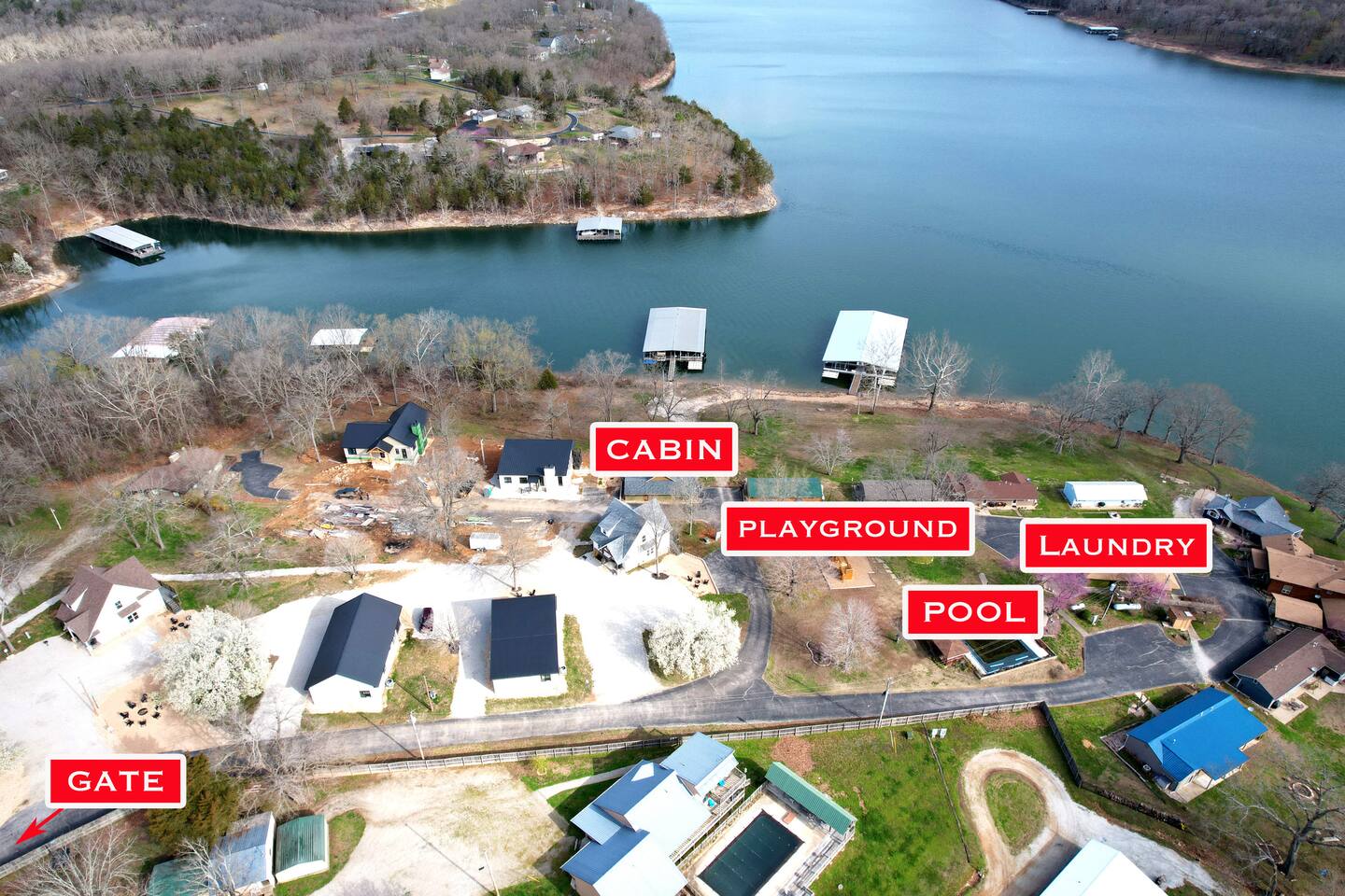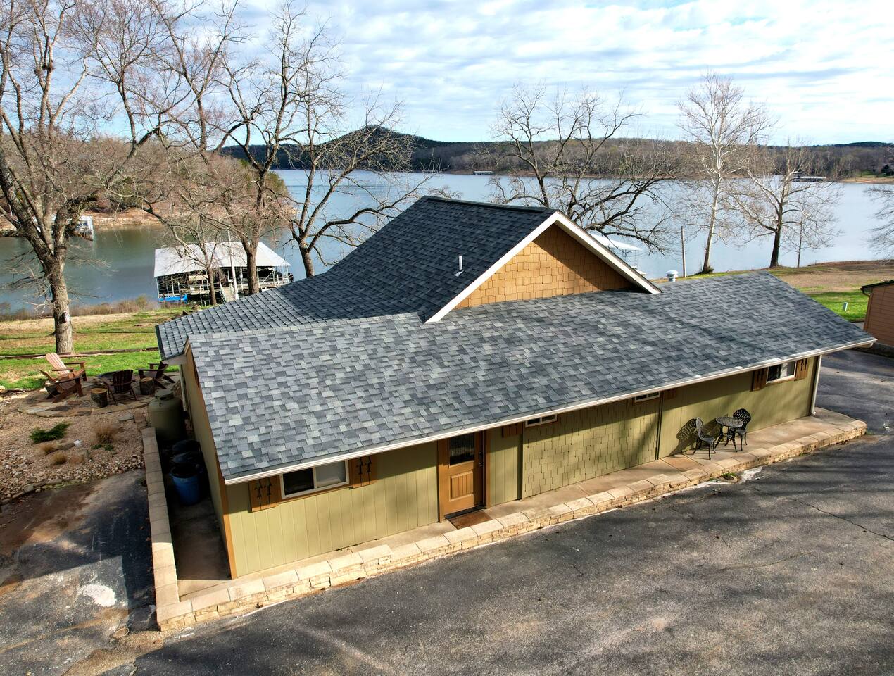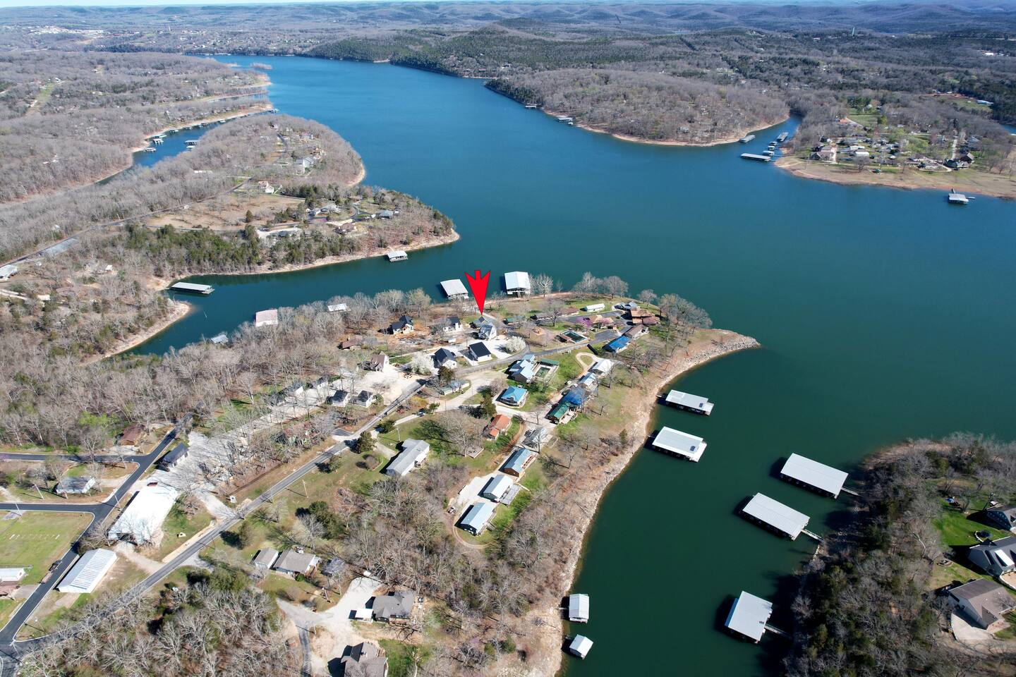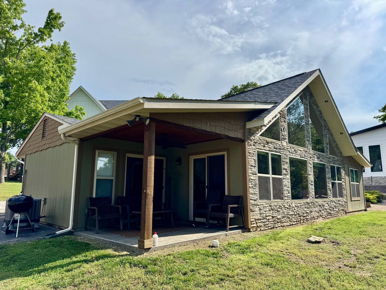 Beautiful lakefront cabin with breathtaking views of Table Rock Lake in Shell Knob, MO—perfect for a peaceful and relaxing getaway. Nestled within a quiet, gated community, this well-appointed 3-bedroom, 2-bathroom retreat offers everything you need for a memorable stay, including access to fantastic amenities like an in-ground pool, a play area for the kids, and a laundry room. The open-concept kitchen and living room is the heart of the home—a wonderful space to gather and enjoy the stunning floor-to-ceiling windows that frame picturesque lake views. The updated kitchen features granite countertops, stainless steel appliances, a gas stove, and a dishwasher. It's fully stocked with cookware, utensils, and more, ensuring you have everything you need to prepare meals. The large island offers plenty of seating for casual dining or conversation, with additional seating available at the spacious wood kitchen table. The living area invites you to unwind on the comfortable sectional and loveseat while streaming your favorite shows or movies on the large flat-panel smart TV with YouTube TV. A Sonos speaker allows you to fill the space with your favorite tunes, whether from your own library or streaming services like Pandora or Spotify. WiFi is available throughout the cabin to keep you connected. Wake up to breathtaking lake views in the master bedroom, which features sliding door access to a covered patio, a luxurious king bed, and an en-suite bathroom for added comfort and privacy. The second bedroom also offers stunning lake views and includes a queen/twin-XL bunk bed, making it ideal for another couple or the kids. The third bedroom is equipped with a cozy queen bed. All bedrooms come with closet space and convenient luggage racks to make your stay even more comfortable. Start your morning with a steaming cup of coffee as the sun rises or unwind in the evening with a refreshing cocktail while soaking in the serene lake views from the covered patio. The lake is just a short walk away, down a gently sloping hill, perfect for a peaceful stroll. For those who enjoy outdoor cooking, a Weber kettle and grilling tools are provided right next to your patio. Kids will delight in the nearby play area and swimming pool, which are just a few steps away and easily visible from the patio seating area, giving parents peace of mind. In the evenings, gather around the private wood firepit, complete with spectacular views of Table Rock Lake, for a memorable and relaxing experience. Looking for water access? Our cabin is near a public boat launch and two great marinas for slip and/or boat rental. Campbell Point Marina is a 14 minute drive (8.2 miles) and Kings River Marina is an 8 minute drive (3.8 miles). Public boat launch is next to the bridge in Shell Knob which is a 6 minute drive (3 miles) and only a few minutes to the cabin by boat. PLEASE NOTE: Per U.S. Army Corps of Engineers rules at Table Rock Lake, we are unable to rent a boat slip. Also, our neighbors at Rod N Reel Resort only can offer slips to guests staying at their resort. Looking for a day away from the water? Consider visiting the Persimmon Hill Blueberry Farm or the breathtaking Dogwood Canyon Nature Park, both just a convenient 15-20 minute drive from the house. If you're up for a bit more adventure, Silver Dollar City, Branson, Top of the Rock at Big Cedar Lodge, or Eureka Springs are all less than an hour away, offering fantastic options for shopping, dining, and entertainment. This cabin holds a special place in our hearts, and we’re delighted to share it with you. We hope you fall in love with it as much as we have and discover why it’s the perfect spot to relax, unplug, and create lasting memories.