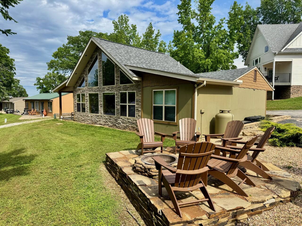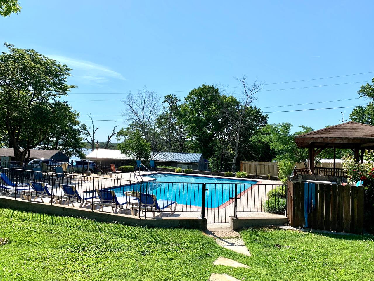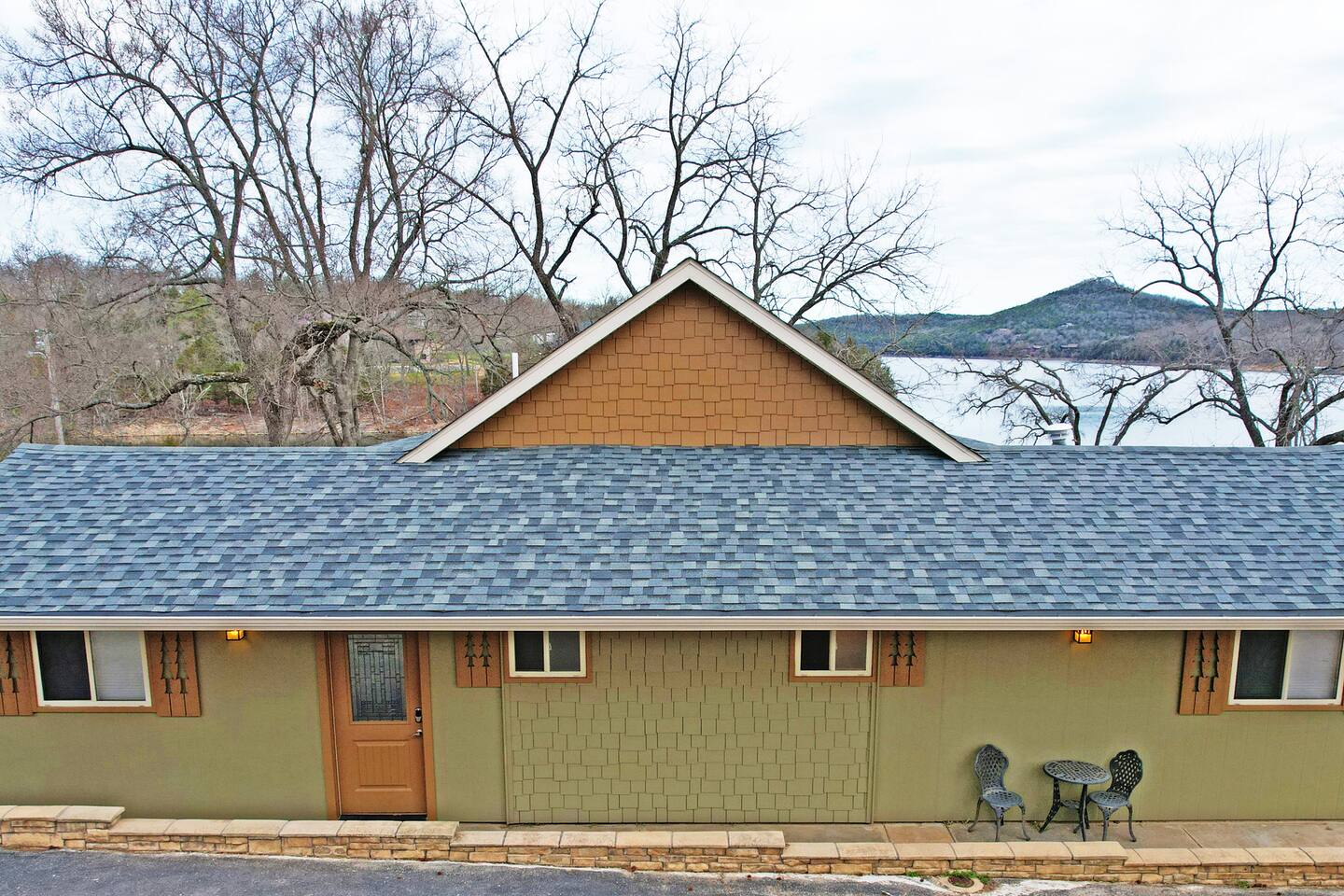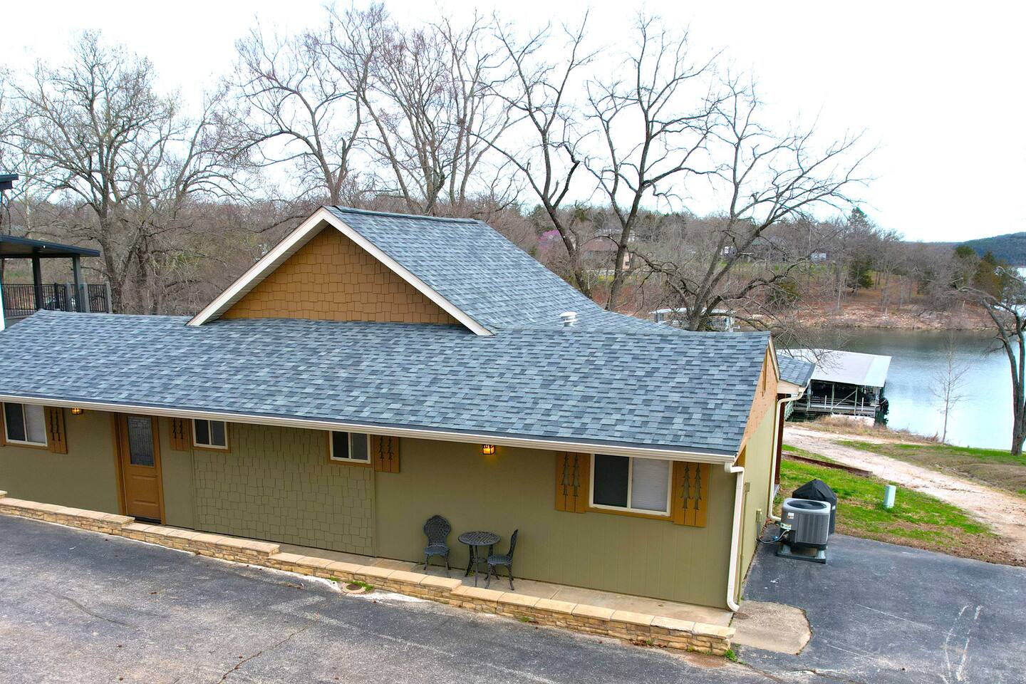Beautiful lakefront cabin with breathtaking views of Table Rock Lake in Shell Knob, MO—perfect for a peaceful and relaxing getaway. Nestled within a quiet, gated community, this well-appointed 3-bedroom, 2-bathroom retreat offers everything you need for a memorable stay, including access to fantastic amenities like an in-ground pool, a play area for the kids, and a laundry room. The open-concept kitchen and living room is the heart of the home—a wonderful space to gather and enjoy the stunning floor-to-ceiling windows that frame picturesque lake views. The updated kitchen features granite countertops, stainless steel appliances, a gas stove, and a dishwasher. It's fully stocked with cookware, utensils, and more, ensuring you have everything you need to prepare meals. The large island offers plenty of seating for casual dining or conversation, with additional seating available at the spacious wood kitchen table. The living area invites you to unwind on the comfortable sectional and loveseat while streaming your favorite shows or movies on the large flat-panel smart TV with YouTube TV. A Sonos speaker allows you to fill the space with your favorite tunes, whether from your own library or streaming services like Pandora or Spotify. WiFi is available throughout the cabin to keep you connected. Wake up to breathtaking lake views in the master bedroom, which features sliding door access to a covered patio, a luxurious king bed, and an en-suite bathroom for added comfort and privacy. The second bedroom also offers stunning lake views and includes a queen/twin-XL bunk bed, making it ideal for another couple or the kids. The third bedroom is equipped with a cozy queen bed. All bedrooms come with closet space and convenient luggage racks to make your stay even more comfortable. Start your morning with a steaming cup of coffee as the sun rises or unwind in the evening with a refreshing cocktail while soaking in the serene lake views from the covered patio. The lake is just a short walk away, down a gently sloping hill, perfect for a peaceful stroll. For those who enjoy outdoor cooking, a Weber kettle and grilling tools are provided right next to your patio. Kids will delight in the nearby play area and swimming pool, which are just a few steps away and easily visible from the patio seating area, giving parents peace of mind. In the evenings, gather around the private wood firepit, complete with spectacular views of Table Rock Lake, for a memorable and relaxing experience. Looking for water access? Our cabin is near a public boat launch and two great marinas for slip and/or boat rental. Campbell Point Marina is a 14 minute drive (8.2 miles) and Kings River Marina is an 8 minute drive (3.8 miles). Public boat launch is next to the bridge in Shell Knob which is a 6 minute drive (3 miles) and only a few minutes to the cabin by boat. PLEASE NOTE: Per U.S. Army Corps of Engineers rules at Table Rock Lake, we are unable to rent a boat slip. Also, our neighbors at Rod N Reel Resort only can offer slips to guests staying at their resort. Looking for a day away from the water? Consider visiting the Persimmon Hill Blueberry Farm or the breathtaking Dogwood Canyon Nature Park, both just a convenient 15-20 minute drive from the house. If you're up for a bit more adventure, Silver Dollar City, Branson, Top of the Rock at Big Cedar Lodge, or Eureka Springs are all less than an hour away, offering fantastic options for shopping, dining, and entertainment. This cabin holds a special place in our hearts, and we’re delighted to share it with you. We hope you fall in love with it as much as we have and discover why it’s the perfect spot to relax, unplug, and create lasting memories.