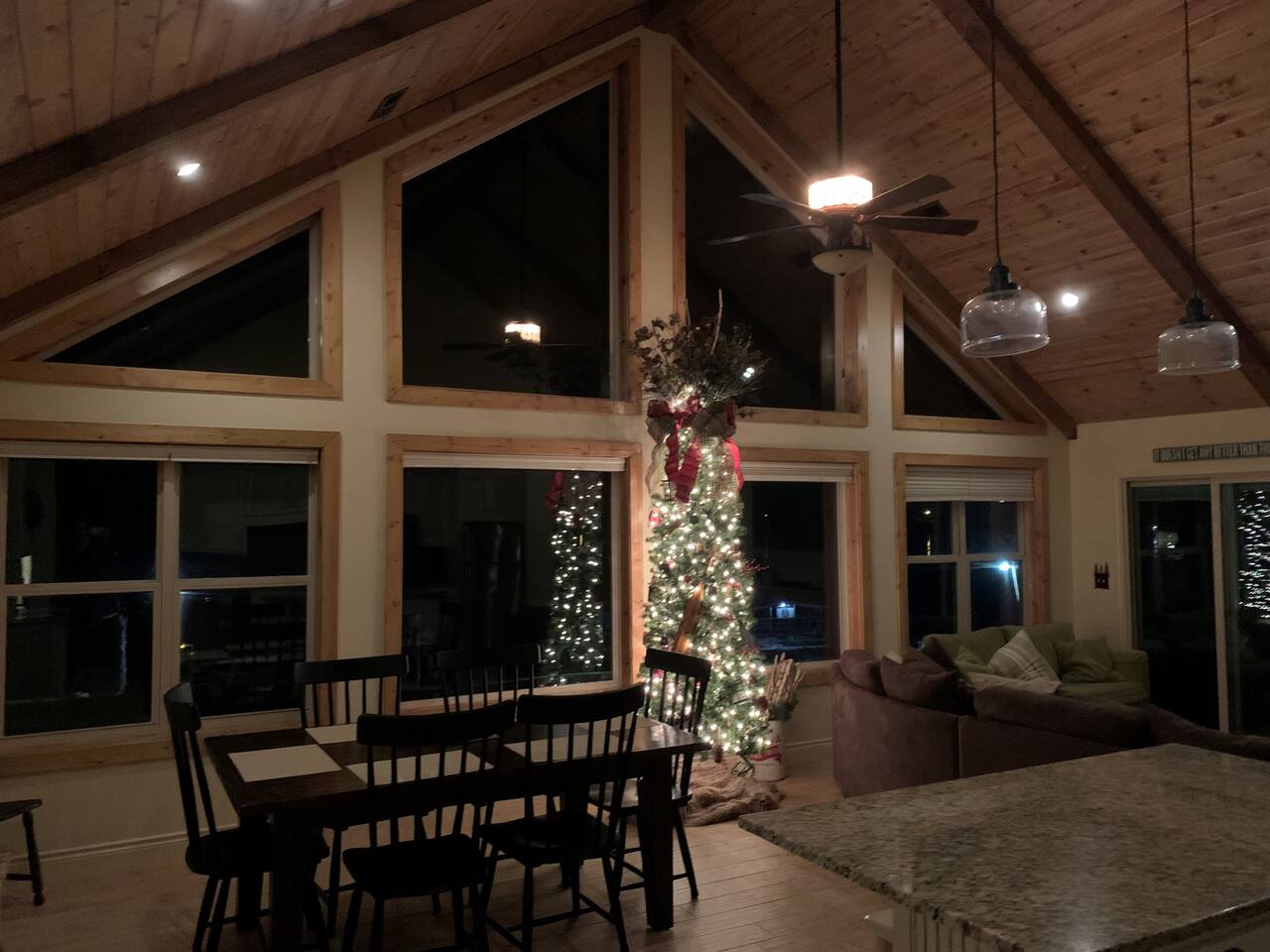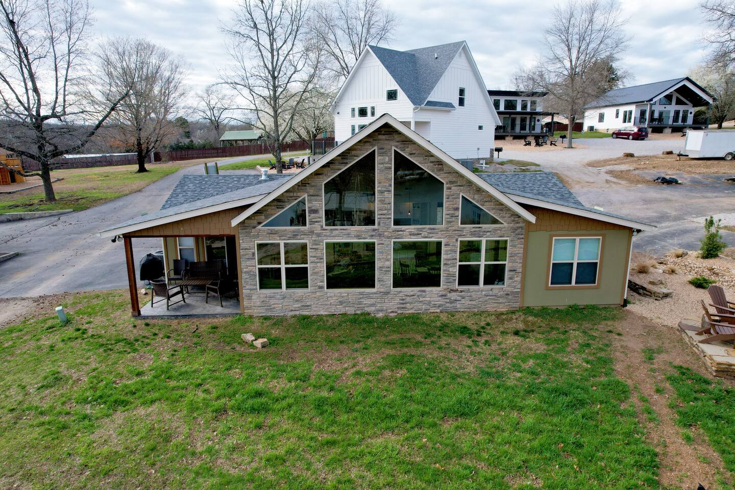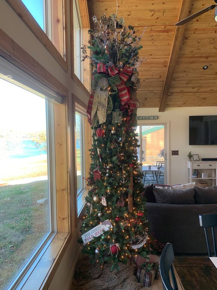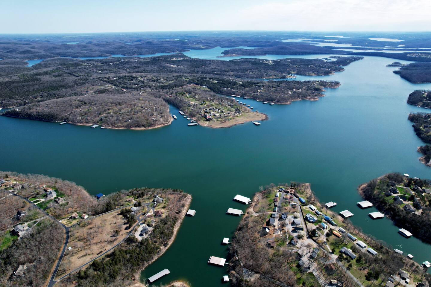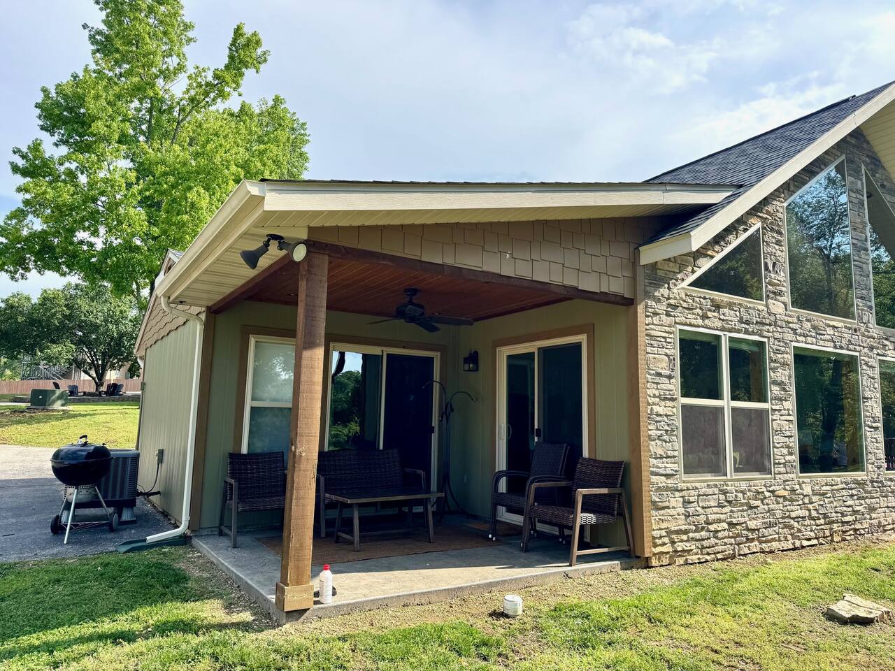Beautiful lakefront cabin with breathtaking views of Table Rock Lake in Shell Knob, MO—perfect for a peaceful and relaxing getaway. Nestled within a quiet, gated community, this well-appointed 3-bedroom, 2-bathroom retreat offers everything you need for a memorable stay, including access to fantastic amenities like an in-ground pool, a play area for the kids, and a laundry room. The open-concept kitchen and living room is the heart of the home—a wonderful space to gather and enjoy the stunning floor-to-ceiling windows that frame picturesque lake views. The updated kitchen features granite countertops, stainless steel appliances, a gas stove, and a dishwasher. It's fully stocked with cookware, utensils, and more, ensuring you have everything you need to prepare meals. The large island offers plenty of seating for casual dining or conversation, with additional seating available at the spacious wood kitchen table. The living area invites you to unwind on the comfortable sectional and loveseat while streaming your favorite shows or movies on the large flat-panel smart TV with YouTube TV. A Sonos speaker allows you to fill the space with your favorite tunes, whether from your own library or streaming services like Pandora or Spotify. WiFi is available throughout the cabin to keep you connected. Wake up to breathtaking lake views in the master bedroom, which features sliding door access to a covered patio, a luxurious king bed, and an en-suite bathroom for added comfort and privacy. The second bedroom also offers stunning lake views and includes a queen/twin-XL bunk bed, making it ideal for another couple or the kids. The third bedroom is equipped with a cozy queen bed. All bedrooms come with closet space and convenient luggage racks to make your stay even more comfortable. Start your morning with a steaming cup of coffee as the sun rises or unwind in the evening with a refreshing cocktail while soaking in the serene lake views from the covered patio. The lake is just a short walk away, down a gently sloping hill, perfect for a peaceful stroll. For those who enjoy outdoor cooking, a Weber kettle and grilling tools are provided right next to your patio. Kids will delight in the nearby play area and swimming pool, which are just a few steps away and easily visible from the patio seating area, giving parents peace of mind. In the evenings, gather around the private wood firepit, complete with spectacular views of Table Rock Lake, for a memorable and relaxing experience. Looking for water access? Our cabin is near a public boat launch and two great marinas for slip and/or boat rental. Campbell Point Marina is a 14 minute drive (8.2 miles) and Kings River Marina is an 8 minute drive (3.8 miles). Public boat launch is next to the bridge in Shell Knob which is a 6 minute drive (3 miles) and only a few minutes to the cabin by boat. PLEASE NOTE: Per U.S. Army Corps of Engineers rules at Table Rock Lake, we are unable to rent a boat slip. Also, our neighbors at Rod N Reel Resort only can offer slips to guests staying at their resort. Looking for a day away from the water? Consider visiting the Persimmon Hill Blueberry Farm or the breathtaking Dogwood Canyon Nature Park, both just a convenient 15-20 minute drive from the house. If you're up for a bit more adventure, Silver Dollar City, Branson, Top of the Rock at Big Cedar Lodge, or Eureka Springs are all less than an hour away, offering fantastic options for shopping, dining, and entertainment. This cabin holds a special place in our hearts, and we’re delighted to share it with you. We hope you fall in love with it as much as we have and discover why it’s the perfect spot to relax, unplug, and create lasting memories.